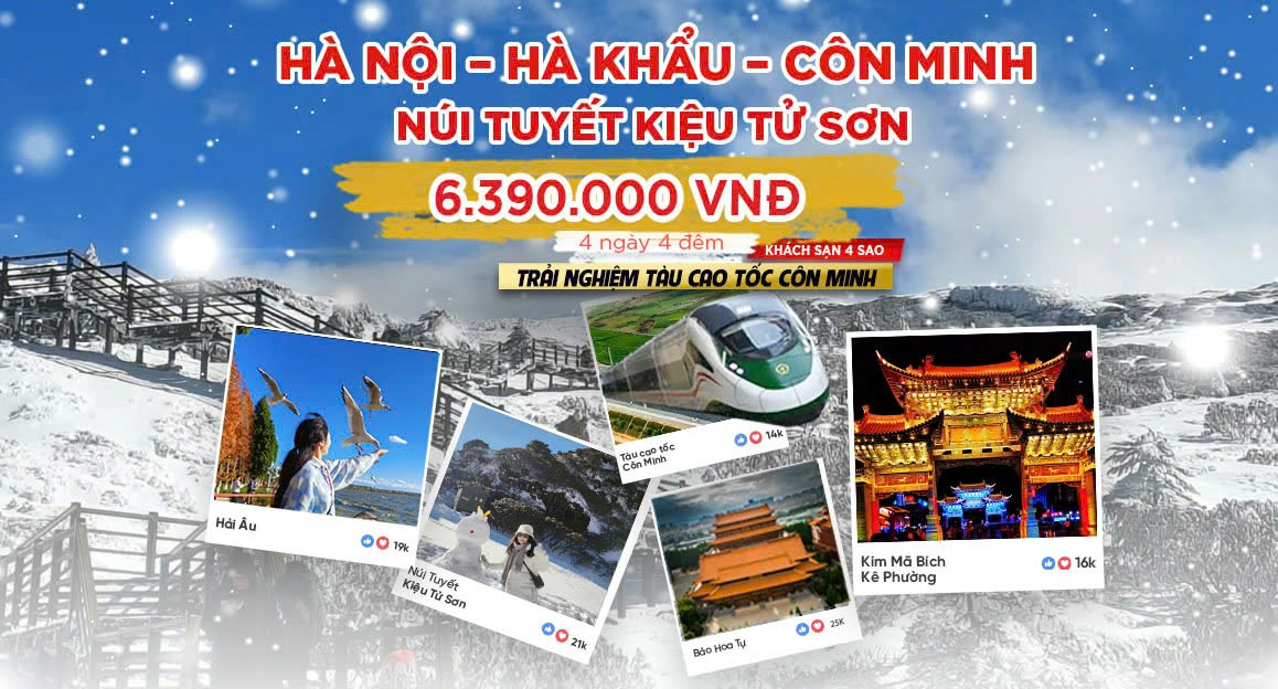 💥 Nghỉ dưỡng tại khách sạn tiêu chuẩn 4 sao trung tâm tại Thành phố Côn Minh và Núi Tuyết Kiệu Tử.